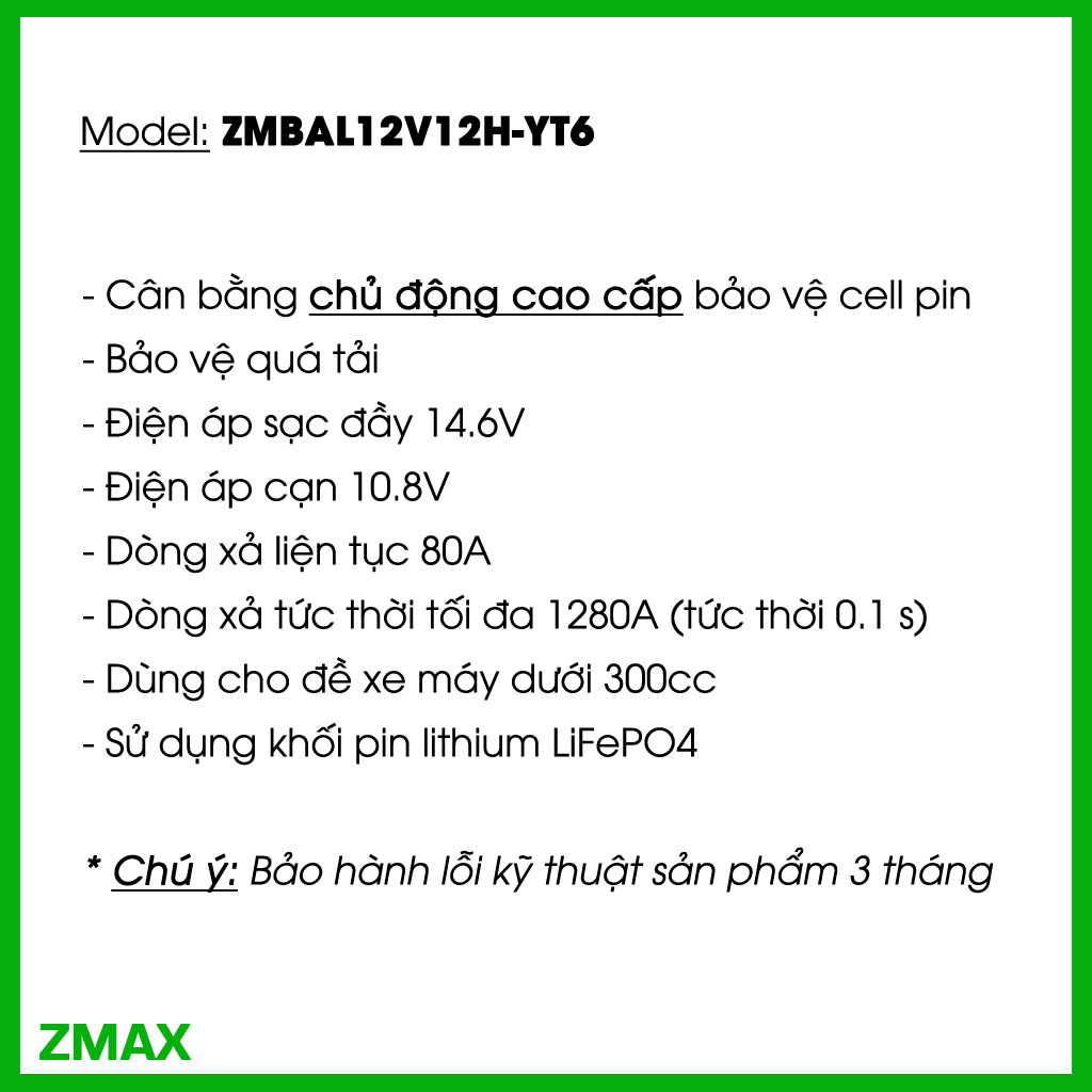 Bình Acquy ZMax Pin Lithium LifePO4 12V 12Ah, ZMBAL12V12H-YT6 là phiên bản nâng cấp tích hợp mạch cân bằng chủ động, mang lại hiệu suất ổn định và tuổi thọ cao cho hệ thống điện xe máy, xe tay ga và xe mô tô. Với công nghệ pin LiFePO4 tiên tiến, sản phẩm đảm bảo khả năng khởi động mạnh mẽ, an toàn tối đa và không cần bảo trì.